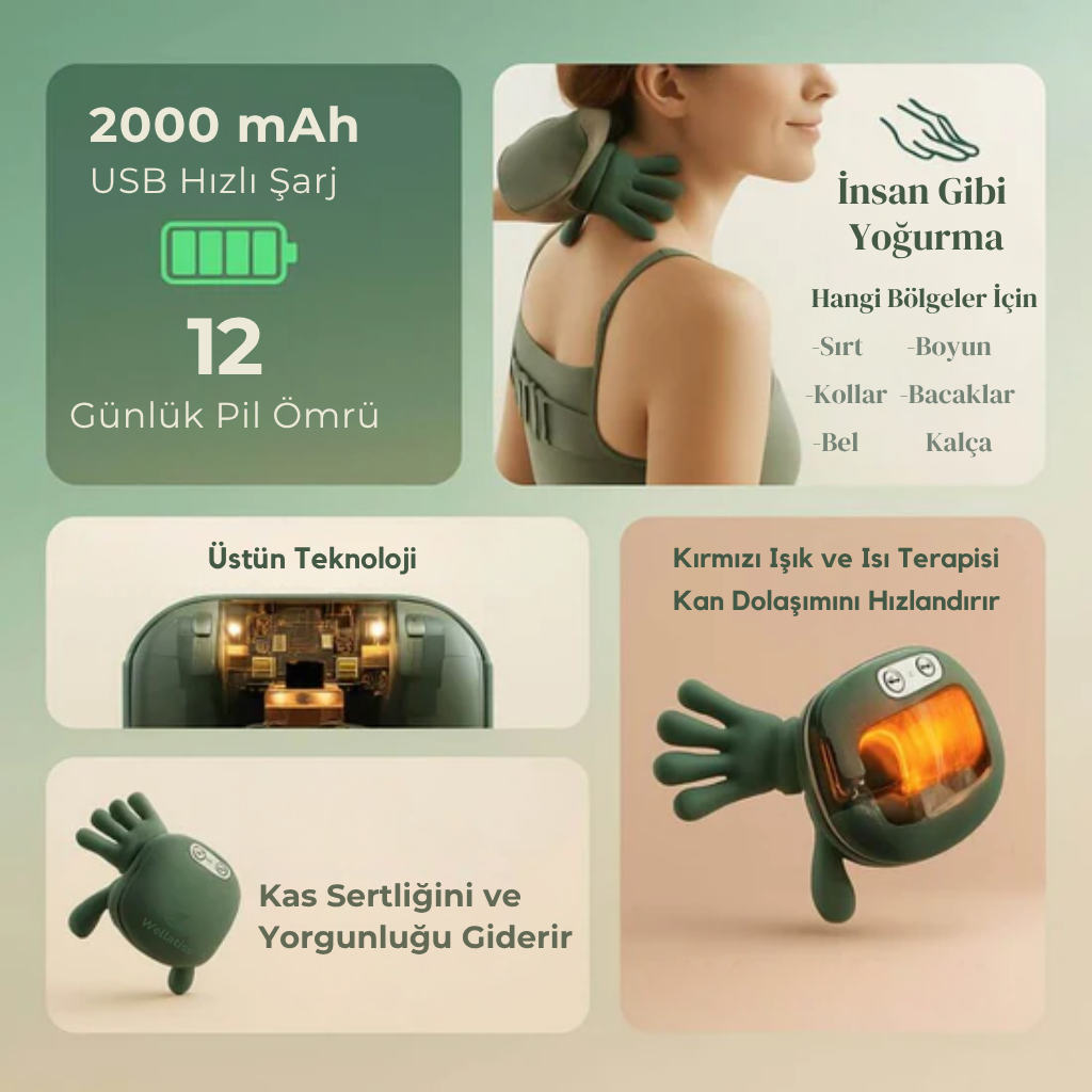 Cihazın içindeki çift motorlu yoğurma mekanizması sayesinde masaj kuvveti, profesyonel bir fizyoterapist dokusuna oldukça yakındır